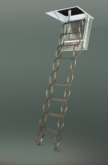 Огнестойкая металлическая конструкция с люком на проем 50х80 см и высотой помещения до 300 см, который может использоваться как преграда распространению огня во время пожара. Лестница изготовлена из оцинкованной стали и обладает высокими показателями огнестойкости (60 минут). По периметру коробки люка, изготовленного из огнеупорного несгораемого материала, установлен контур уплотнения, который расширяется под влиянием температуры и ограничивает проникновение дыма. Лестница LSF имеет российский сертификат, подтверждающий соответствие требованиям пожарной безопасности. Благодаря «ножничной» системе складывания в сложенном состоянии лестница имеет небольшие размеры. Лестница LSF поставляется с монтажным комплектом LXK. Максимальная нагрузка на лестницу 200 кг.