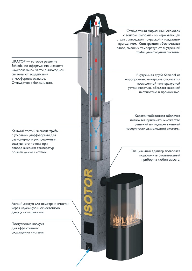 SCHIEDEL ISOTOR — это модульная двухконтурная дымоходная система с активным охлаждением от компании с 75-летним опытом в области дымоудаления и вентиляции. В комплект её поставки входят все необходимые элементы и аксессуары для обеспечения надежной работы. Дымоходная система ISOTOR используется для отвода продуктов сгорания от подключенных к ней теплогенераторов во внешнюю среду и подходит для всех твердотопливных отопительных приборов, таких как: печи, камины, банные печи и каменки для саун.