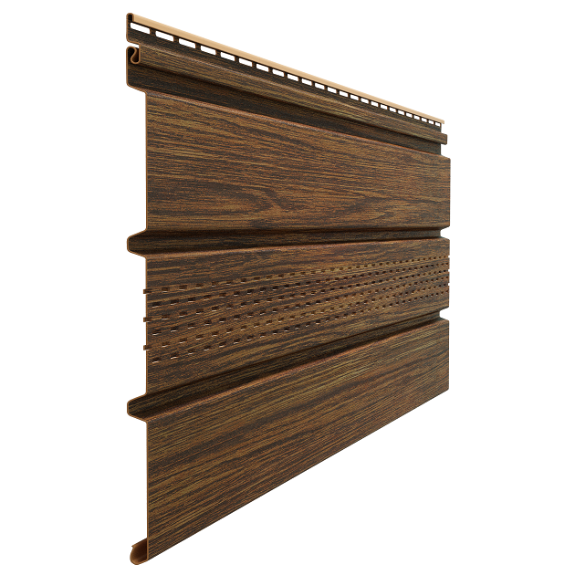 Софит с центральной перфорацией применяется для подшивки свесов кровли, перфорация в центральной части панели служит для поступления воздуха в вентиляционный зазор кровельного"пирога". Цветовая гамма софита Docke Lux имитирует структуру ценных пород дерева.