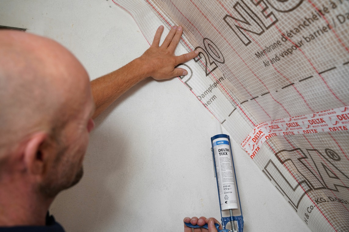 DELTA(r)-TIXX - Клей для герметичного и воздухонепроницаемого соединения любой пароизоляционной плёнки DELTA(r) со стенами, металлическими и деревянными элементами крыши. Не требуется использование прижимной планки.