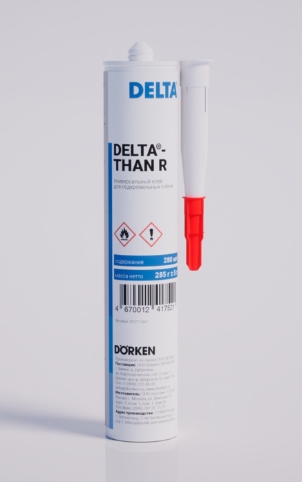 DELTA(r)-THAN R - Сохраняющий эластичность универсальный клей для соединения гидроизоляционных плёнок в местах нахлёста и примыкания к конструкциям из кирпича, бетона, дерева. Обеспечивает водо- и воздухонепроницаемое соединение.