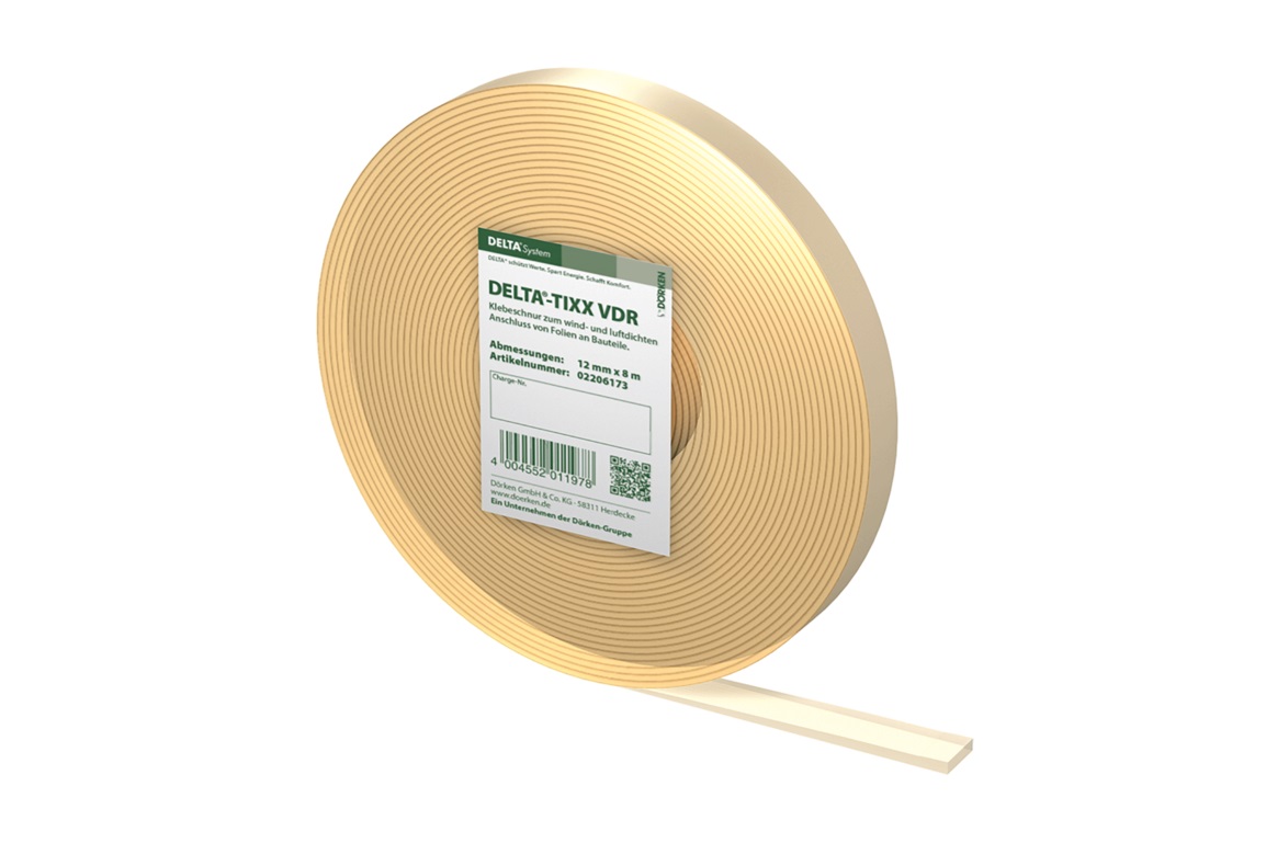 DELTA(r)-TIXX VDR - Клеевой шнур для воздухонепроницаемого примыкания пароизоляционных плёнок к стенам с гладкой поверхностью, такой как бетон, штукатурка или деревянные поверхности.