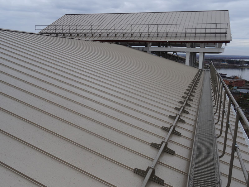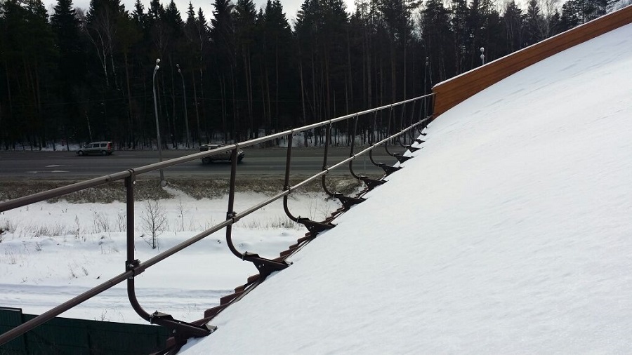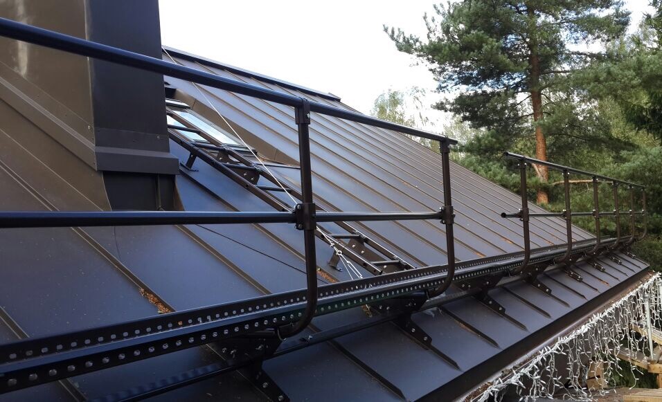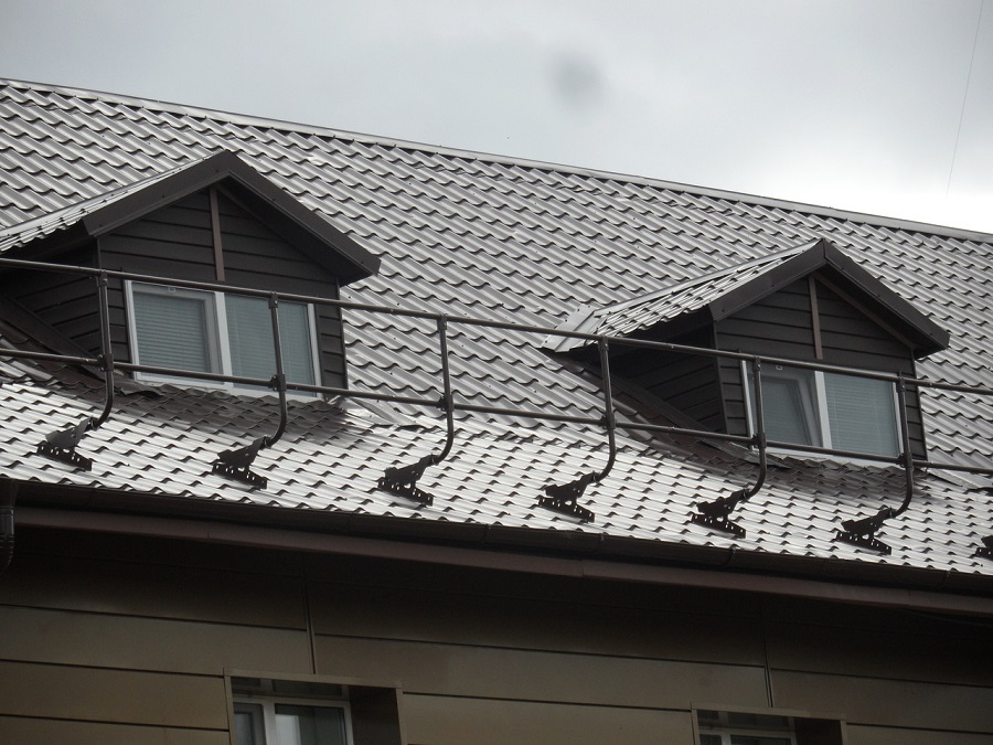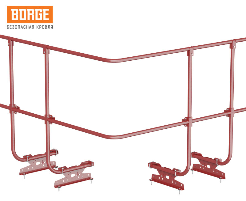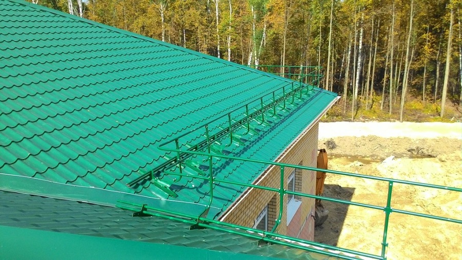Кровельное ограждение устанавливается на карнизном свесе по периметру кровли, ограждение может быть дополнено угловыми соединениями, трубками снегозадержания, а также переходными мостиками. Высота ограждения может быть 0,6 м, 0,9 м, 1,2 м. Материал оцинкованная сталь, порошковая окраска.