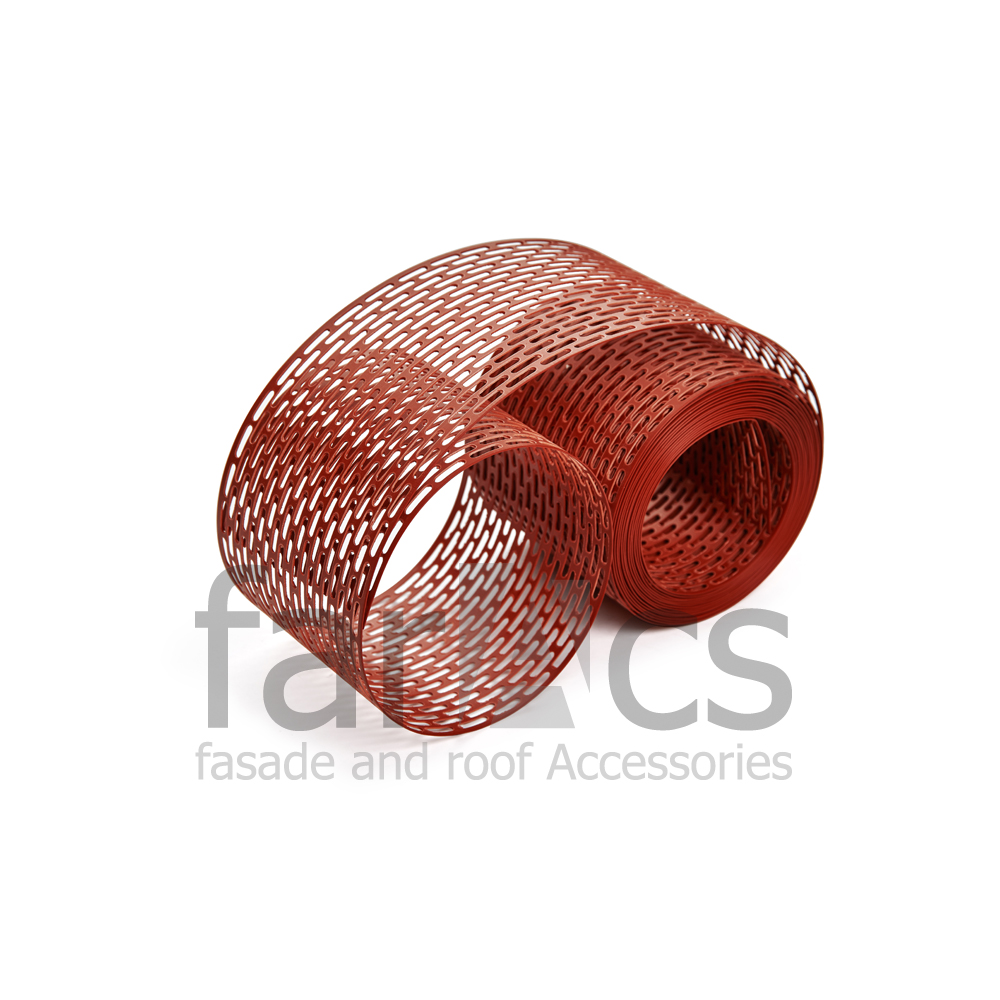 Вентиляционная лента Faracs из пвх предназначена для обустройства карнизного свеса кровли. По всей длине ленты для обеспечения вентиляции нанесены отверстия. Ширина ленты 10 см, длина 5 метров. Выпускается она в четырех цветах: белом, черном, коричневом и красном. Использоваться вентиляционная лента может с любым типом кровельного покрытия вент фасада, начиная от профнастила и заканчивая всеми видами черепицы. Для крепления используются оцинкованные гвозди или шурупы с шагом 18-20 см.