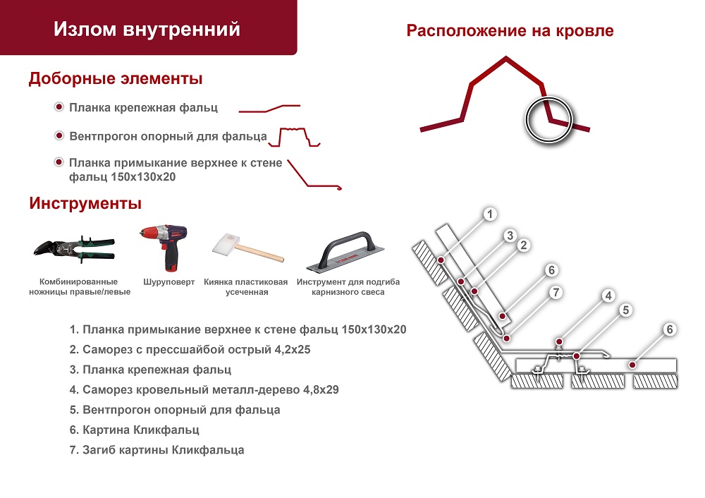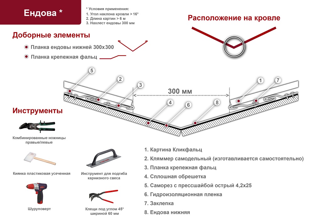 Крепежная планка используется для фиксации картин фальца в ендове, узле внутреннего излома, местах горизонтального нахлеста картин. Длина планки 2м.