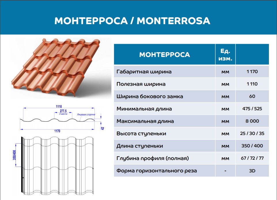 Металлочерепица Монтерросса новинка 2018 г от компании Металлпрофиль. Изящная плавность изгиба волн и рельефный профиль увеличенной высоты придают особую выразительность кровле, выгодно выделяя ее на фоне соседниз построек. Отличительными особенностями нового профиля являются усовершенствованный двойной замок вдоль листа, обеспечивающий сто процентную защиту от протечек и горизонтальный 3D рез листов черепицы, с полной достоверностью имитирующий натуральную черепицу.При заказе можно выбрать высоту ступеньки S/M/X - 25/30/35мм и длину волны 350мм или 400мм. Листы производятся в диапазоне длин от 0,5 до 8м.