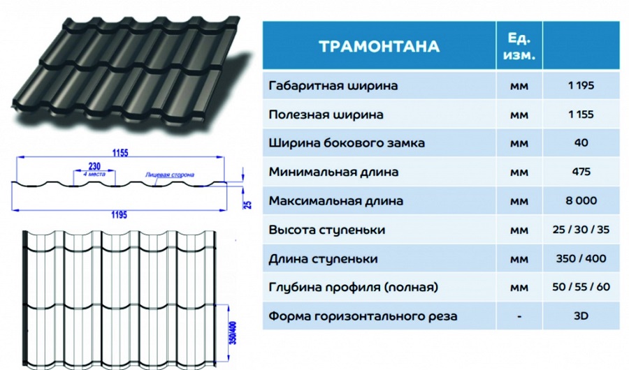 Трамонтана новинка 2018 г от компании Металлпрофиль. Профиль имеет усиленную геометрию, что значительно повышает устойчивость кровли к ветровым нагрузкам. Металлочерепица имеет горизонтальный 3D рез листов, с полной достоверностью имитирующий натуральную черепицу.При заказе можно выбрать высоту ступеньки S/M/X - 25/30/35мм и длину волны 350мм или 400мм. Листы производятся в диапазоне длин от 0,5 до 8м.