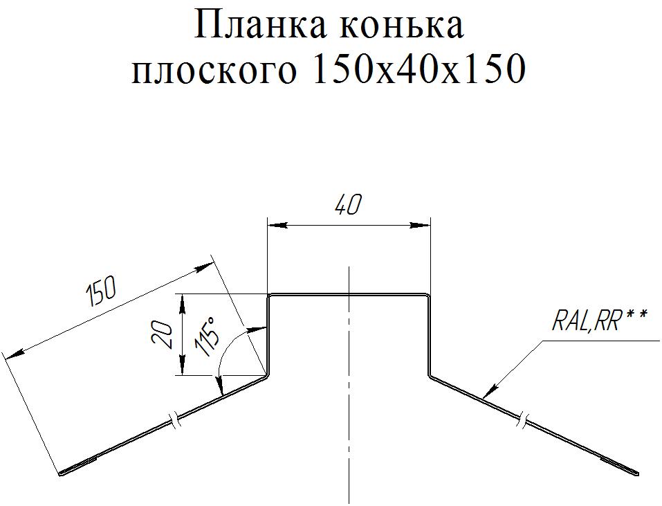Планка конька плоского 150*40*150 мм. защищает от атмосферных осадков коньки кровли, носит декоративную функцию. Плоский конек не требует установки торцевых заглушек, длина планки 2м. Рекомендуется установка рулонного аэроэлемента под коньковую планку. Матовое полимерное покрытие Pural Matt.