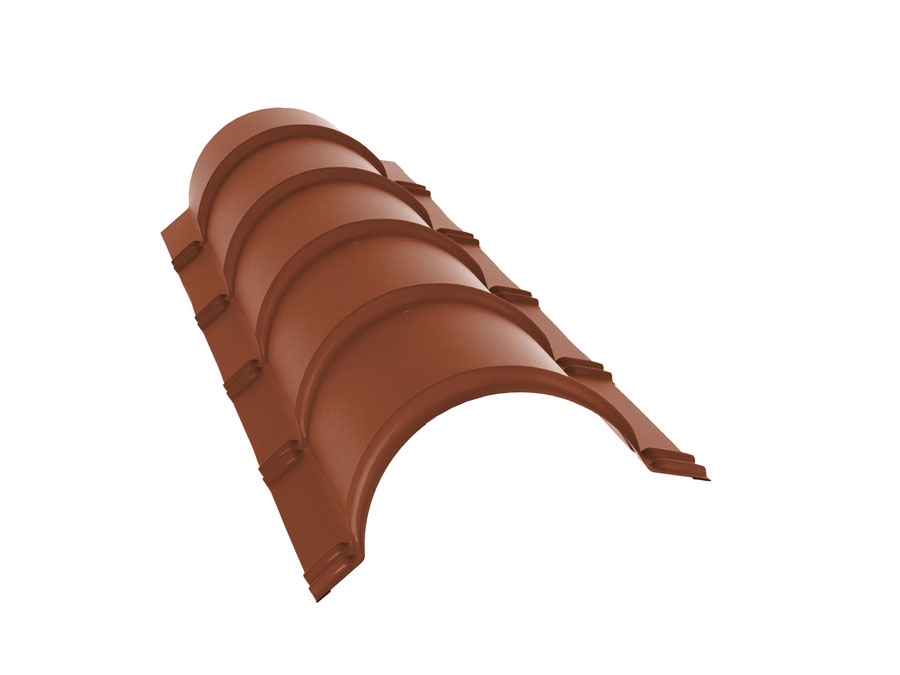 Планка конька полукруглого защищает от атмосферных осадков коньки кровли, носит декоративную функцию. В торцы полукруглого конька необходимо устанавливать торцевые или конусные заглушки, длина планки 1,97м. Рекомендуется установка рулонного аэроэлемента под коньковую планку. Глянцевое полимерное покрытие Полиэстер.