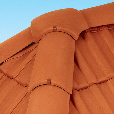Вальмовая черепица применяется для обустройства стыка двух наклонных коньков (хребтов) и горизонтального конька крыши. Специализированные зажимы для крепления в комплекте.