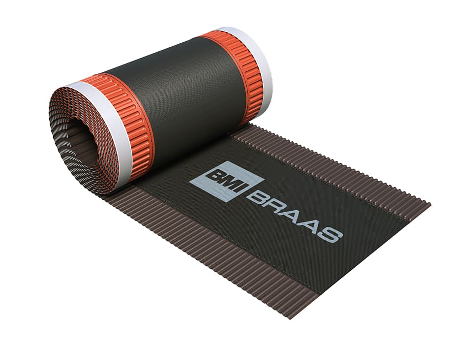 Аэроэлемент конька/хребта Браас - рулонный материал с центральной воздухопроницаемой мембраной, самоклеящимися полосами и защитной антиадгезионной пленкой. Изготавливается из алюминия, полипропилена и бутилкаучука. Длина рулона 5 м, ширина 300 мм.