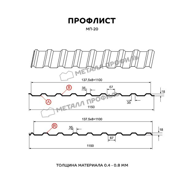 Профнастил МП-20 - самый популярный профиль для заборов и облицовки стен. Ширина листа 1150 мм, полезная ширина листа 1100 мм. Готовые листы в наличии на складе высотой 2000 мм, покрытие полиэстер. Толщина металла 0,45 мм. Тип профиля А.