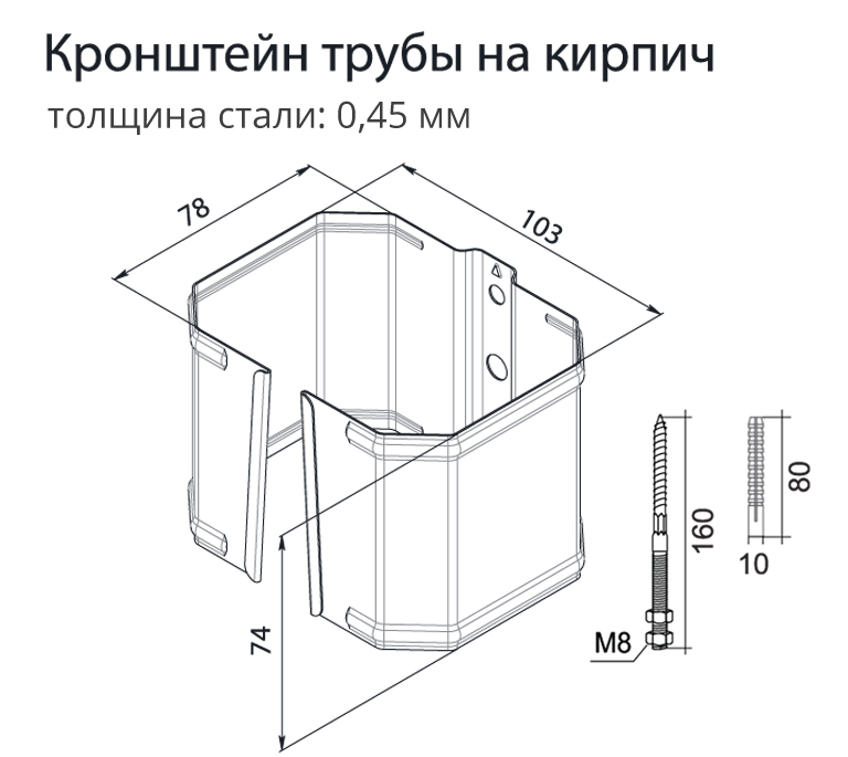 Кронштейн трубы на кирпич предназначен для фиксации трубы к стене. (под ключ / биту Torx T25, общая длина метиза - 160 мм).