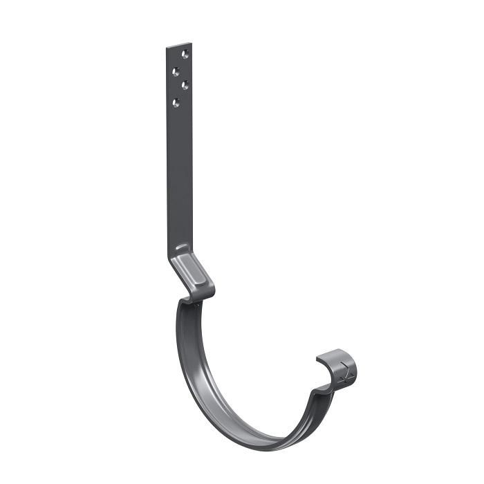 Крюк крепления желоба Aquasystem диаметром 150 мм — цельнометаллический, изготовлен из стали толщиной 4 мм. Крюк обеспечивает силовую поддержку желоба и неизменность его геометрических параметров, создаёт уклон, необходимый для движения воды в заданном направлении. Благодаря ребрам жесткости обладает повышенной прочностью, выдерживает большие силовые нагрузки.