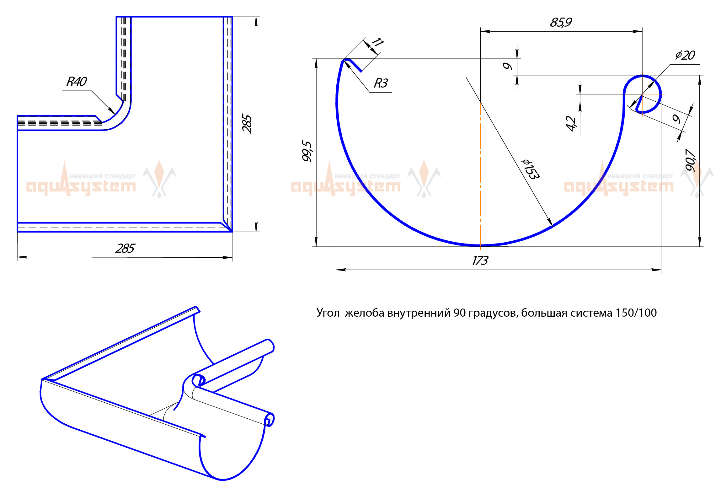 Угол желоба Aquasystem диаметром 150 мм внутренний 90 градусов устанавливается на внутренних углах кровли и предназначен для изменения направления движения воды.