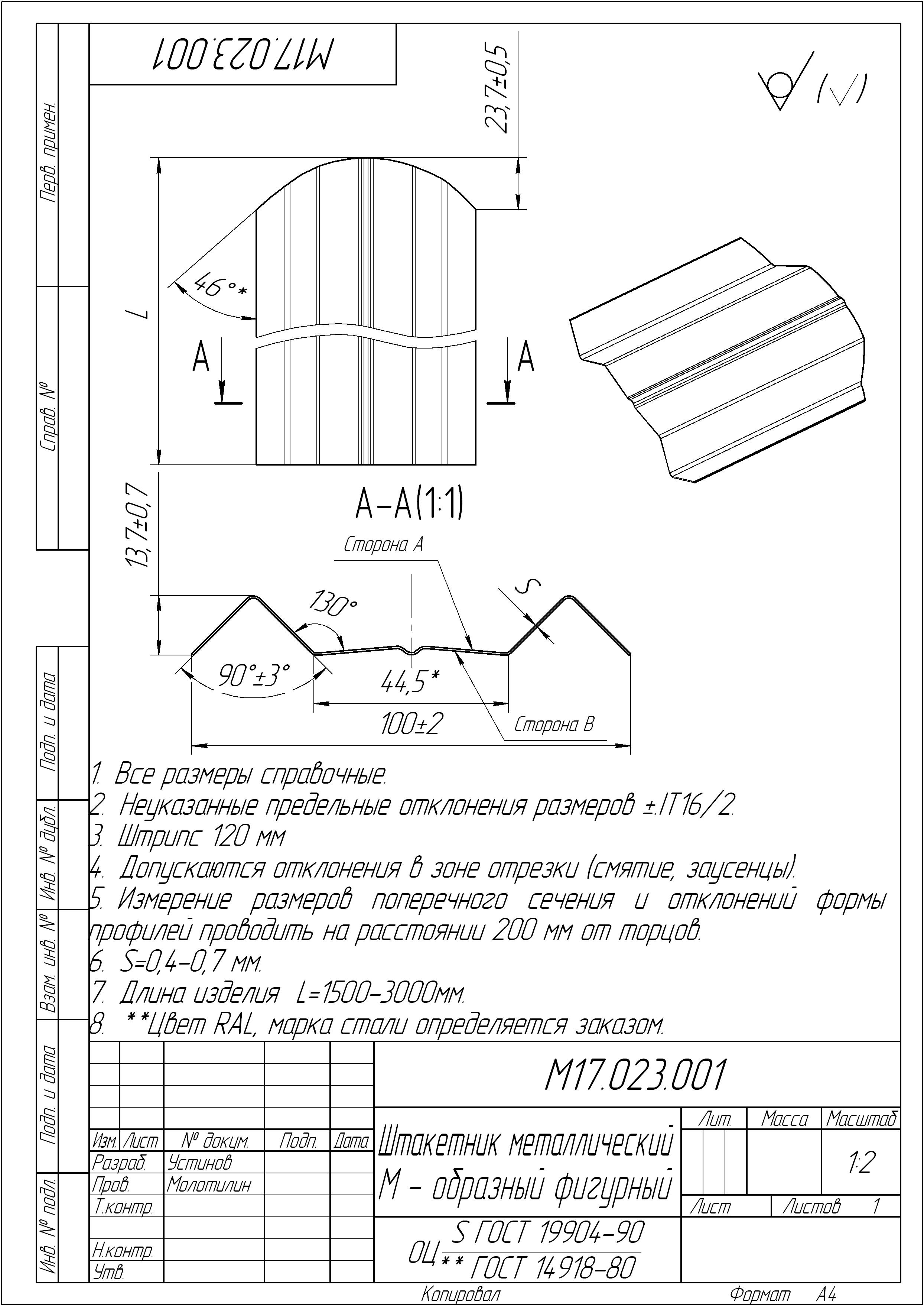 М - образный штакетник производится под заказ в диапазоне длин от 0,5 до 3 м с шагом 1 см, на заказы суммарной длиной менее 72 м.п. может взиматься наценка. Ширина штакетника 100 мм.