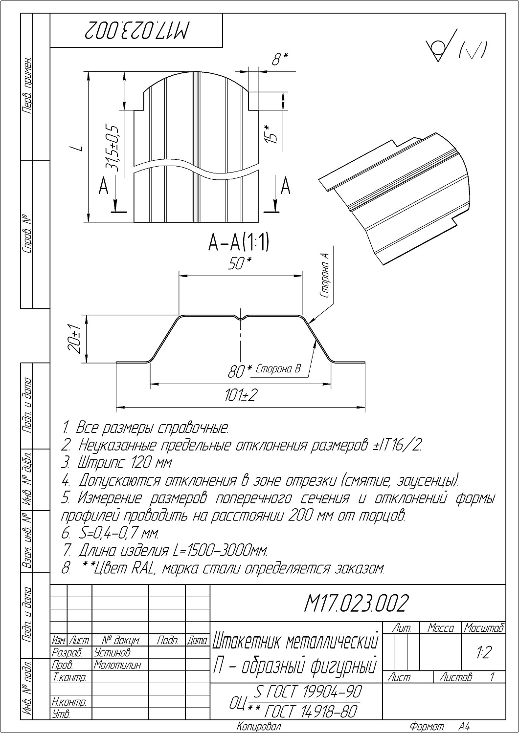 П - образный фигурный штакетник (с декоративным полукруглым резом в верхней части) производится под заказ в диапазоне длин от 0,5 до 3 м с шагом 1 см, на заказы суммарной длиной менее 72 м.п. может взиматься наценка. Ширина штакетника 100 мм.