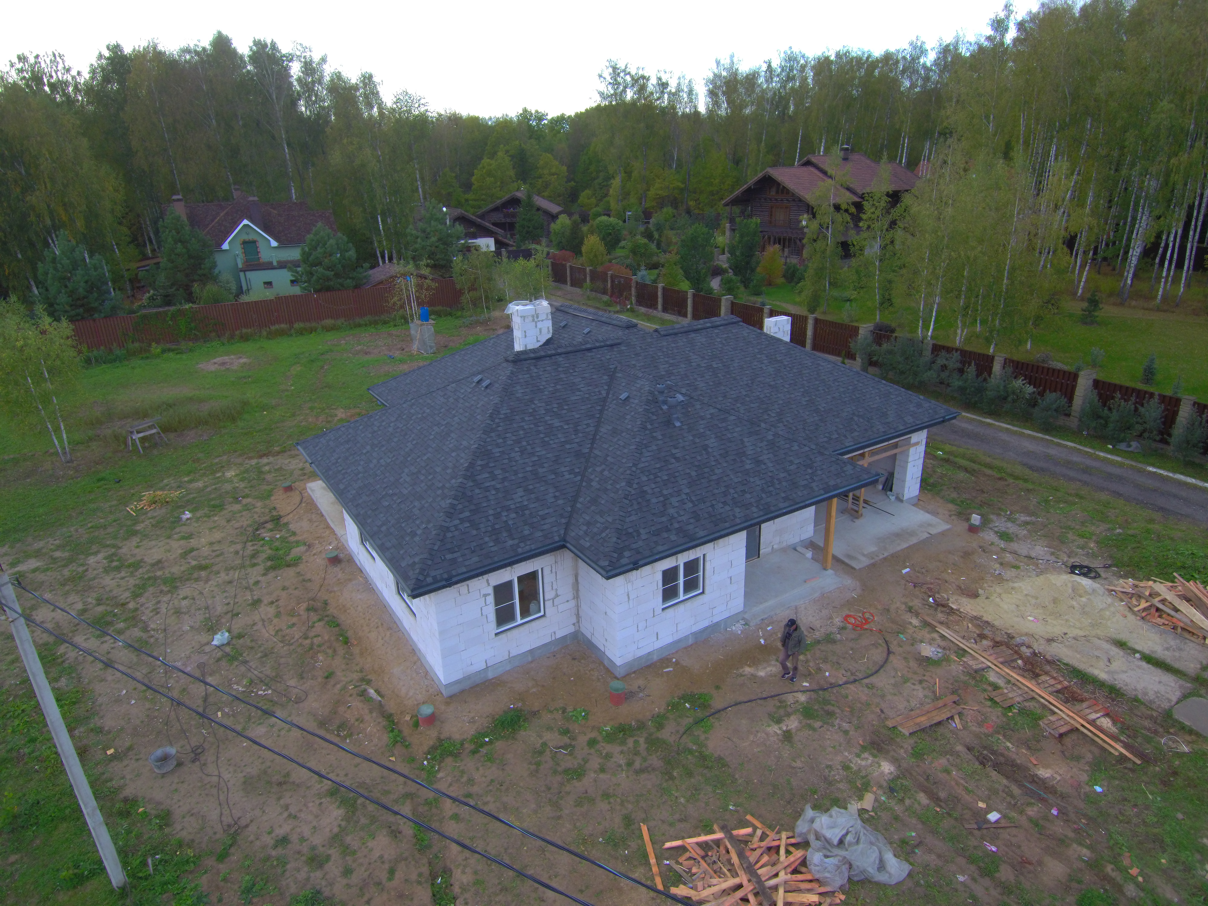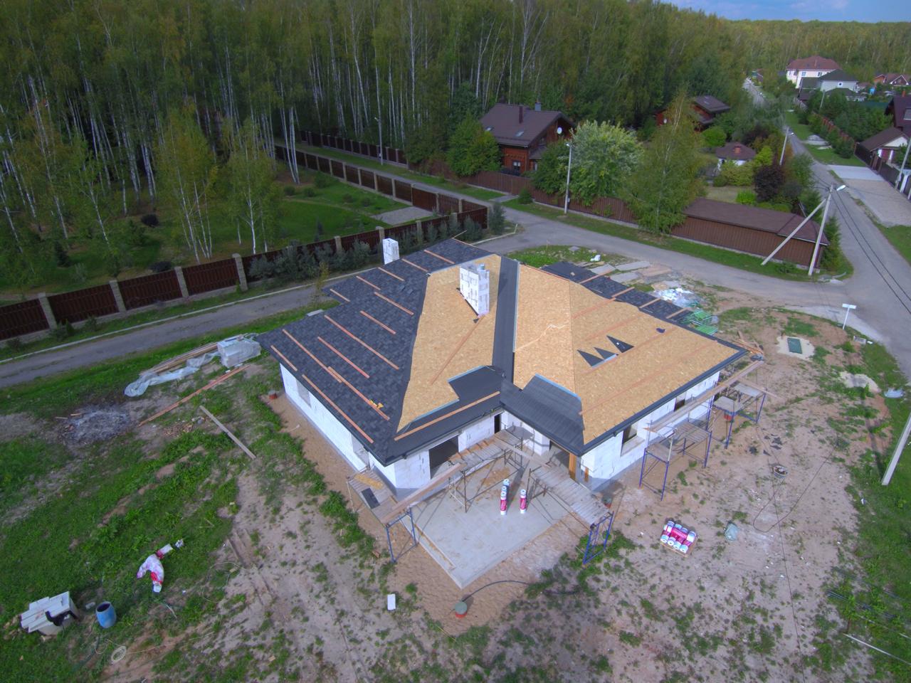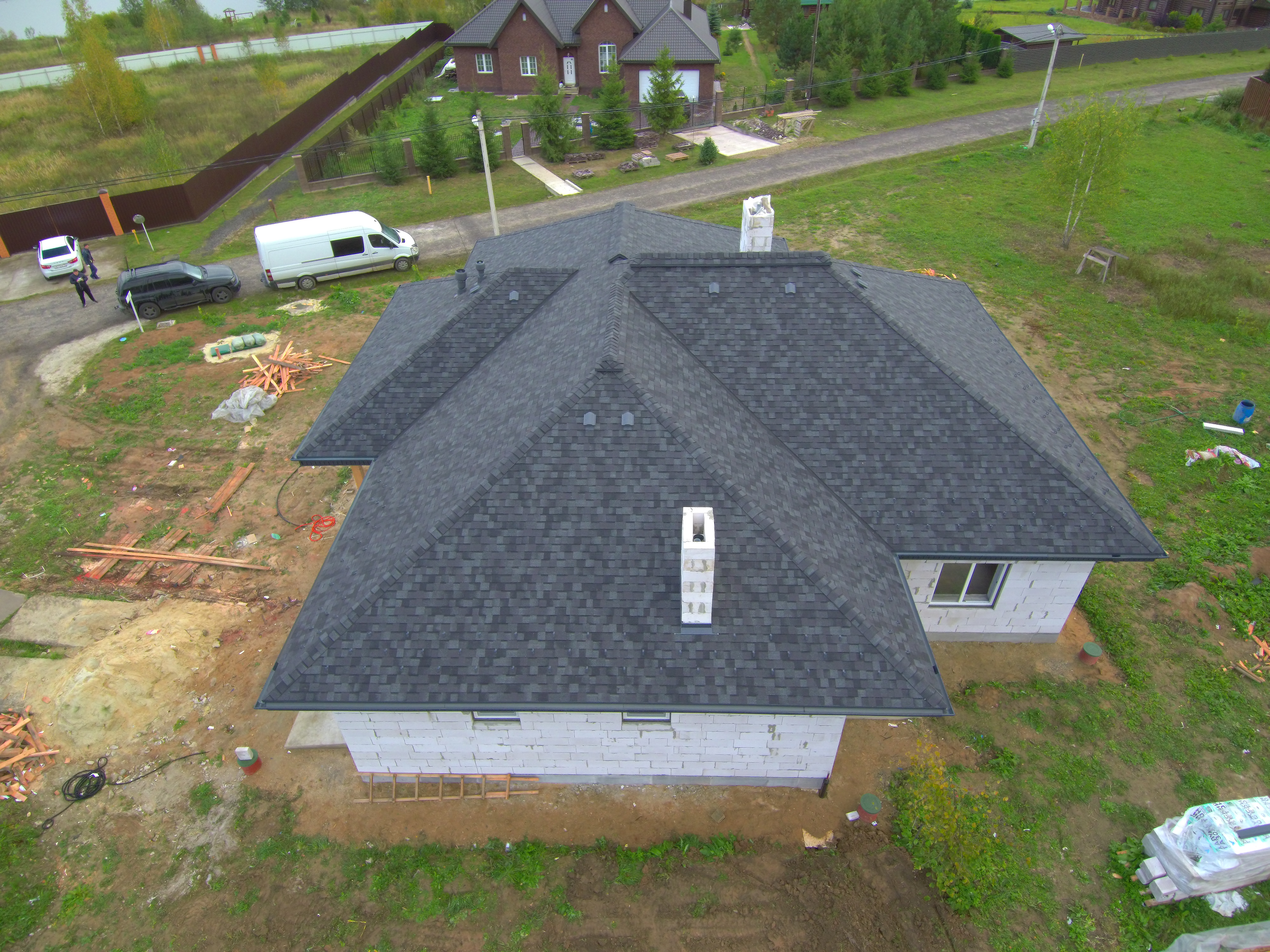 4. Укладка ламинированной гибкой черепицы, устройство вентиляционных коньков, установка штучных аэраторов подкровельного пространства, снегостопоров для гибкой черепицы. Монтаж водосточного желоба.