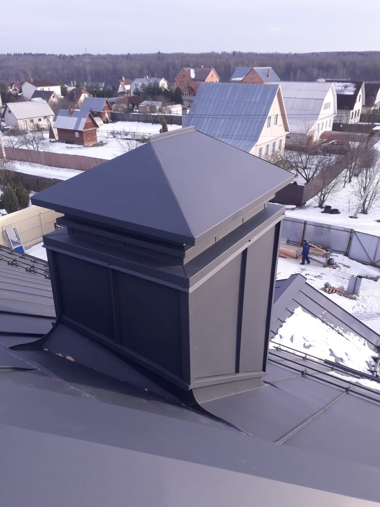 3. Обшивка трубы фальцевыми картинами, установка флюгарка на трубу. Устройство примыкания кровельных картин к трубе.